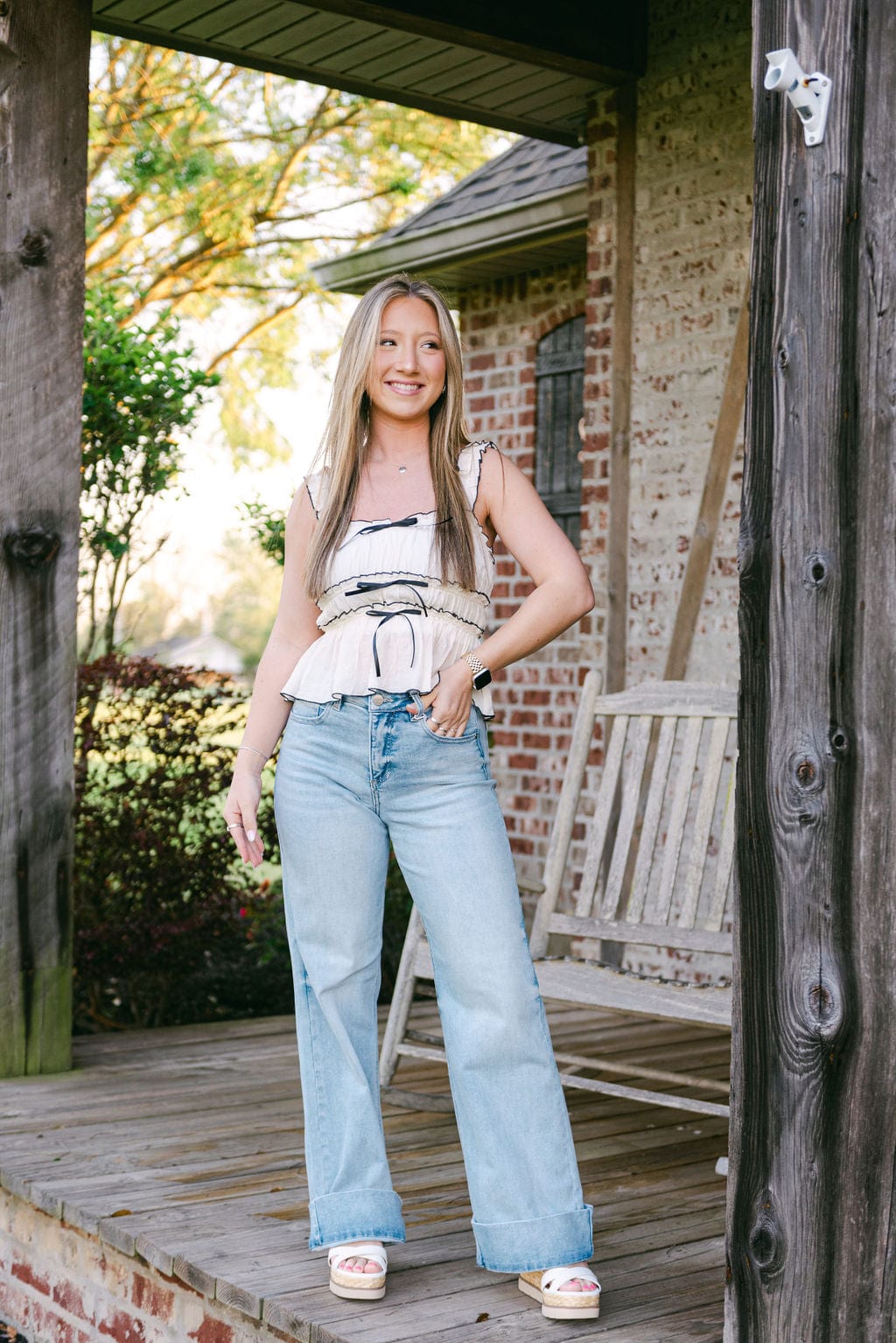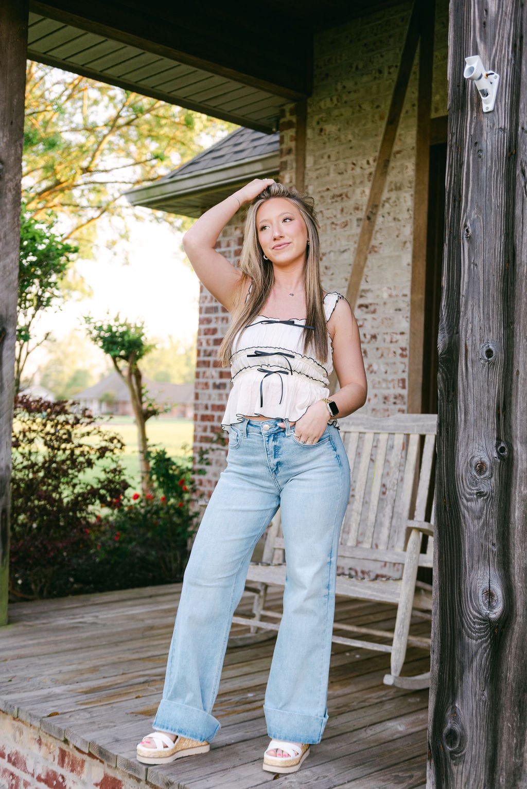 Elevate your Spring wardrobe with our Ivory Contrast Bow Detail Top. The white and black contrast trim adds a touch of sophistication while the ruched detail and stretchy fabric provide comfort and a flattering fit. The bow detail and square neckline add a feminine touch to this sleeveless top. Don’t miss out on this must-have piece!